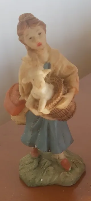 Figura de pastora para el Belén, con detalles artesanales. 10 centímetros. - Incluye una oveja y una cesta. - Base con textura de hierba.