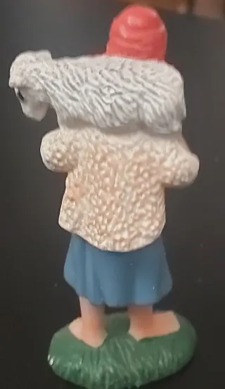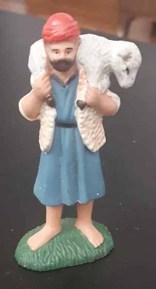 Figura de pastor con oveja, ideal para belenes. Es resistente ya que es plástico fuerte. Mide 9 centímetros. - Detalle de vestimenta tradicional. - Oveja blanca con textura. - Base verde imitando césped.