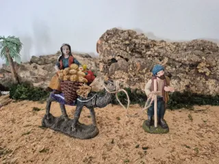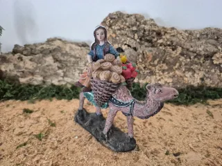 Conjunto de figuras para belén, ideal para ambientar tu escena navideña. - Figura de pastor con vestimenta tradicional. - Figura de camello con carga. - Cesta con alimentos y frutas. - pintadas a mano - figura solo mujer con camello (20€)