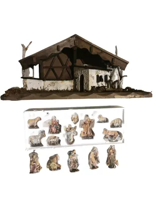 Conjunto de belén con figuras. El tamaño de las figuras es de 15 cm la más alta. El portal está algo deteriorado pero es enorme mide 64x40 cm y 34 cm. De alto. - Figuras incluidas para el belén. - Tamaño de las figuras: 15 cm.