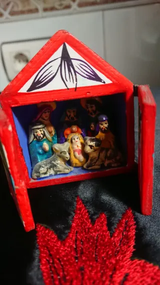Pequeño belén de estilo andino, ideal para coleccionistas o decoración. Las figuras están bien, lo blanco de las fotos no son defectos - Figuras detalladas. - Estructura de madera pintada a mano. - Representación de la natividad.