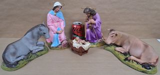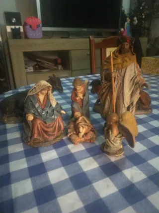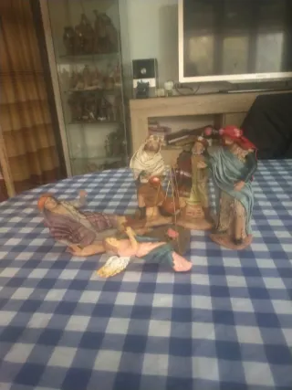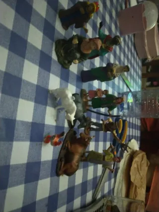 12 figuras coleccionables o decorativas, típicas de la Navidad en España. • El conjunto incluye varias figuras, como Jesús, María, un ángel con una estrella y animales. • Están fabricadas en resina y presentan un aspecto vintage o de segunda mano, ideal para coleccionistas o decoración navideña tradicional.