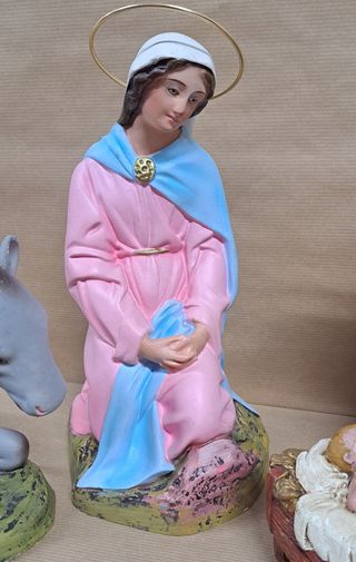 Figuras de Belén de estuco gran tamaño Miden 25 cm de altura la virgen, el buey 29 cm de largo y la mula 26 cm. Tienen algunos retoques en la policromía, El estado es bueno tal y como se puede ver en las fotos, estas son parte de la descripción, si necesita mas imágenes o información del producto no dude en hacérnoslo saber, le facilitaremos la información lo antes posible.