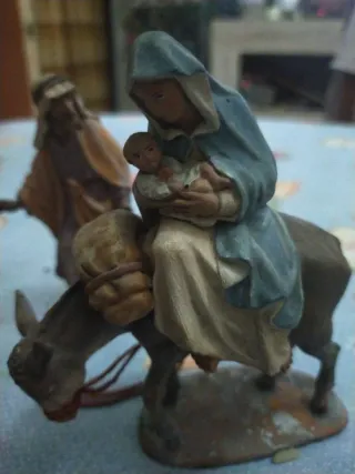 Figura de belén de la serie 11 de Castells, representando la huida a Egipto. Antigua - Detallada figura de la Sagrada Familia. - Incluye José, María con el niño Jesús y el burro. - Fabricada en barro, leves grietas en las patas de la mula,