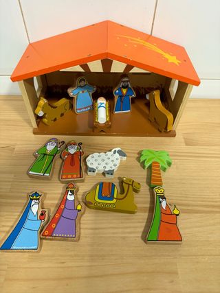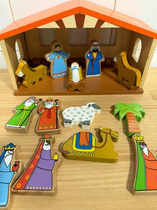 Conjunto de figuras de madera para un belén infantil. - Incluye figuras de María, José, el niño Jesús, los Reyes Magos, un camello, una oveja, un árbol y un caballo. - Estructura de madera para el portal. - Decorado con colores vivos. tal cual las fotos tamaño de las figuras 9 cm y altura del portal 16 cm