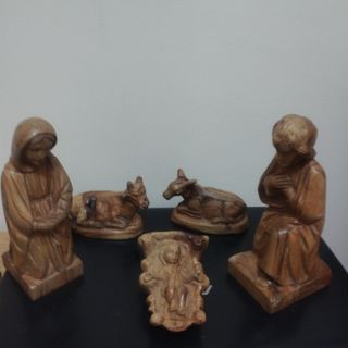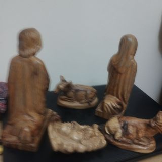 Conjunto de figuras para belén, talladas a mano en madera de olivo. - Figuras de un nacimiento. - Material: Madera de olivo. - Hecho a mano. Compradfo en Tierra Santa hace años las figuras son preciosas y bien talladas. tiene dos pequeños desperfecto la mula tiene pegada parte de la oreja y al buey el loma. adjunto fotos para que vean que no se aprecia practicamente, de hay su precio medidas: san jose 19x7x10 cm, Virgen María 18x6x7cm, Niño Jesús 5x7x10cm , Mula 10x7x5 cm y Buey 11x8x6 cm . Miren en mi perfiñl dispongo de mas nacimientos.