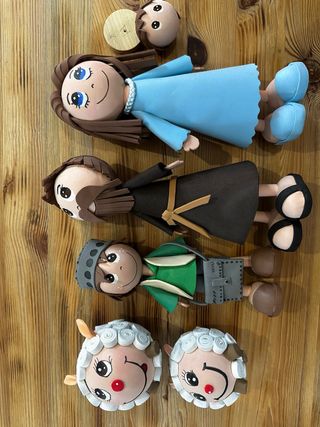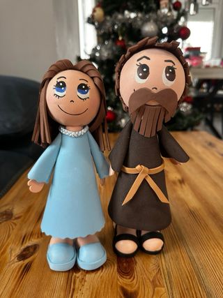 Conjunto de figuras fofuchas “Belén” Están pendientes de terminar, habría que pegarlas a una base y acabar el niño Jesús. De ahí el precio (si no sabes hacer fachas basta con qué envuelvas la cabecita en una tela simulando una mantita ) Ideales para decorar en Navidad. Las medidas en altura son: Maria y José, aproximadamente 24 cm Pastor 19 cm Ovejas, hay una ligeramente más grande que la otra, pero aprox. son 8 cm