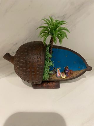 Original nacimiento navideño presentado dentro de una bellota de cerámica Una pieza única que combina la tradición con un diseño original. - Figuras del nacimiento de Artesanía Serrano ( barro ) - Decoración con palmera y musgo. - Base de barro para soporte.