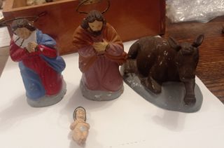 Precioso nacimiento artesanal de los años 50, ideal para coleccionistas. Se compone de cuatro figuras: la Virgen María, San José, el Niño Jesús y un buey. Las figuras antiguas están pintadas a mano, con un toque rústico encantador. Algunas muestran señales de desgaste por el paso del tiempo, lo que les da un encanto especial. - Figuras de belén antiguas - Material: barro - Años 50 - 4 piezas,mide niño Jesús 4cm sin corona,las virg en y José 8 cm son corona y la mula largo 11cm
