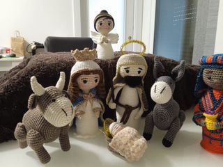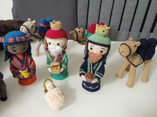 Belén completo con las siguientes figuras: - Virgen - San José - Niño Jesús - Ángel - Mula - Buey - Melchor - Gaspar - Baltasar - 3 camellos Se pueden añadir o quitar figuras y personalizar los colores. Altura máxima de las figuras unos 18 cm, pero se pueden hacer de otros tamaños. POR ENCARGO.
