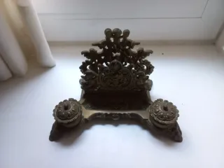 Escribanía bronce, de principios del siglo XX. Diseño ornamentado con figuras.
