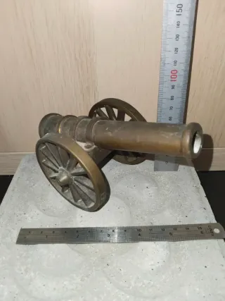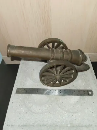 Réplica de cañón antiguo en miniatura, fabricado en bronce. Si aflojas las ruedas, las mismas rotan. Mide uno 18 centimetros. - Diseño detallado con ruedas. - Material: Bronce. Coleccion, coleccionismo, antiguo, antiguedad, coleccionista, viejo, retro, vintage, belico, guerra, militar, maqueta, figura, figurita