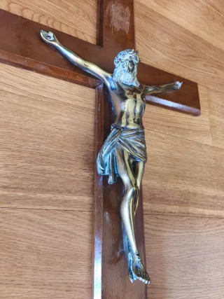 Cruz de bronce con una detallada figura de Cristo crucificado. Su diseño ornamentado le da un toque clásico y religioso. - Material: Bronce. - Diseño: Figura de Cristo crucificado. - Estilo: Ornamentado y clásico.