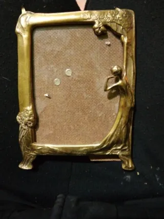 Elegante marco de bronce con un diseño artístico. - Material: Bronce. - Diseño con figura femenina y motivos florales. - Ideal para exhibir tus fotografías.