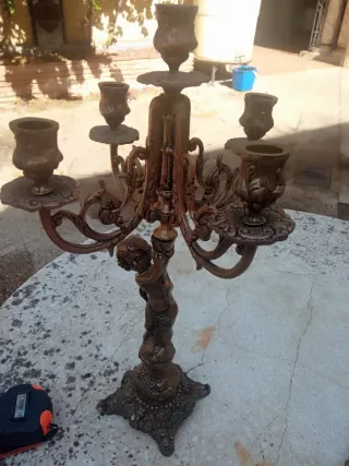 Elegante lámpara candelabro de bronce con un diseño clásico. - Base cuadrada ornamentada. - Figura central de querubín. - Cinco brazos con detalles. - Cristales colgantes decorativos.