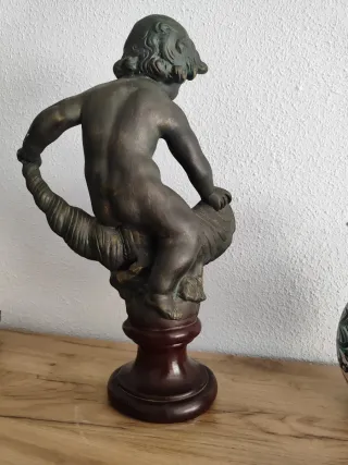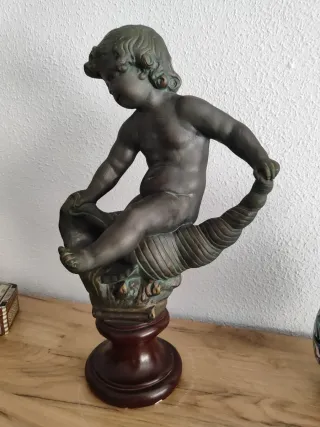 Estatua decorativa de bronce que representa a un niño sentado en una concha marina. - Material: Bronce. - Diseño: Niño en concha. - Base: Madera oscura.