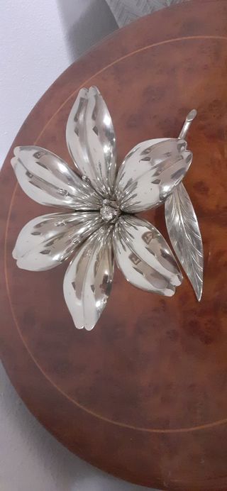 Gran cenicero de bronce plateado con forma de flor. Hecho en España, original de los años 50/60. Consta de un tallo con 2 hojas y una flor de 6 pétalos que pueden desmontarse para ser ceniceros. Una joya única con una bonita pátina vintage. tous, plata, iphone, móvil, smartphone, reloj, oro, algora, gucci, vuitton, Rolex, cartier, lladro, versace, molinillo, chanel, campana, manises, anillo, moneda, numismática, lámpara, dior, quinque, joyería, hermes, escultura, figura, iglesia, almirez, ikea, casa, piso, muebles latón, cacharel, lancome, mortero, porcelana, pulsera, perfume, cocina, loewe, diamante, militar, brillante cocina