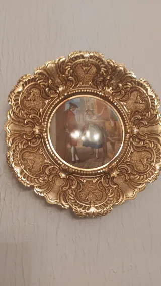 Precioso plato decorativo con un marco de bronce ornamentado. La escena central representa una pintura clásica. - Marco de bronce con detalles. - Pintura central con figuras. - Diseño ornamental.