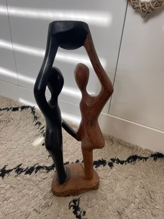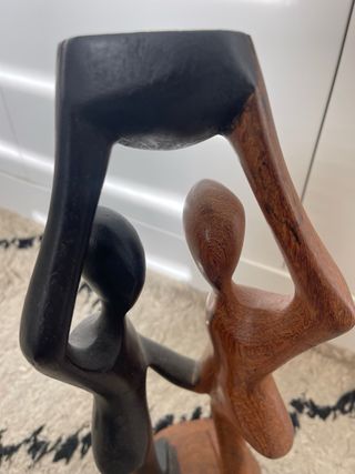 Figura decorativa de madera que representa una pareja en un abrazo abstracto. La pieza tiene un acabado pulido y un diseño moderno. - Hecha de madera. - Diseño abstracto de pareja. - Acabado pulido.