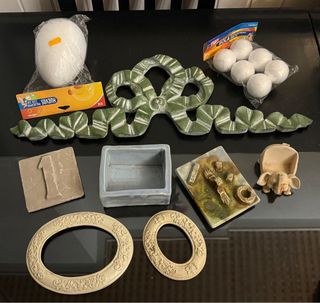 Lote variado de figuras y artículos de adorno. - Figura de elefante de cerámica. - Dos marcos decorativos. - Caja pequeña de cerámica azul. - Placa decorativa con número 1. - Adorno de serpiente verde. - Adorno de lazo verde. - Bolas blancas de poliestireno. Precios: preguntar