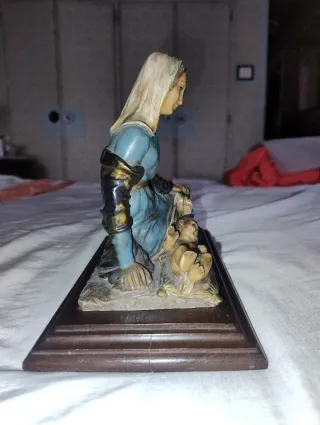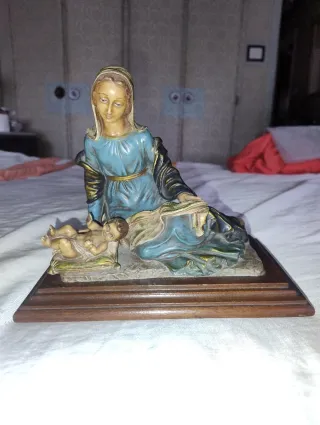 Figura decorativa de una escena de maternidad, con la Virgen María y el Niño Jesús. 19 cm de altura 22,5 cm de largo 12,5 cm de fondo - Base de madera. - Detalles pintados a mano.