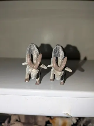 Dos figuras de cabras en miniatura, listas para la acción. Marmolina - Altura aproximada de 5 cm.y 7cm largo - Diseño detallado de cabras en pose de lucha.
