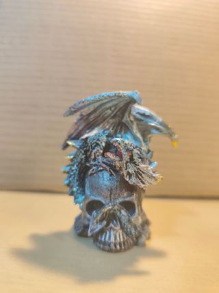 Figura decorativa de un dragón con detalles en azul y plateado, posado sobre una calavera. - Diseño de fantasía. - Colores azul y plateado predominantes. - Detalle de alas y escamas.