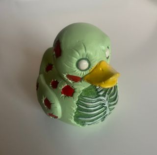 Figura decorativa con forma de pato y diseño de personaje de eterror casico. Hecha y pintada a mano. Decoración duradera que añade un toque divertido a cualquier espacio, hogar u oficina. Material: Resina Dimensiones (Largo x Ancho x Alto): 7.3 x 6.1 x 7 cm - Diseño detallado con textura. - Colores llamativos y contrastantes.