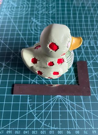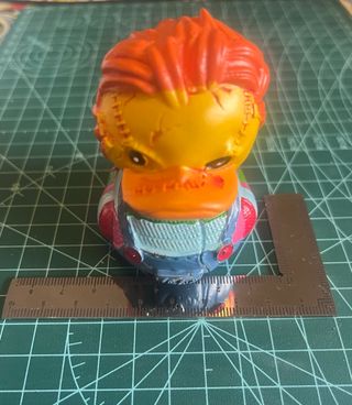 Figura decorativa con forma de pato y diseño inspirado en pelicula de terror con Chucky. Hecha y pintada a mano. Decoración duradera que añade un toque divertido a cualquier espacio, hogar u oficina. Material: Resina Dimensiones (Largo x Ancho x Alto): 7.7 x 5.6 x 7.5 cm