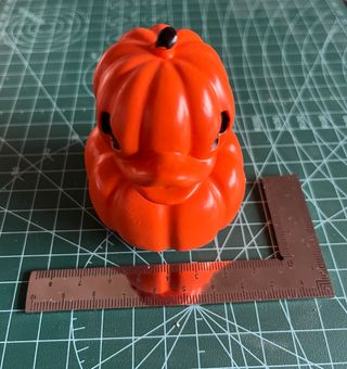 Figura decorativa con forma de pato y diseño calabaza. Hecha y pintada a mano. Decoración duradera que añade un toque divertido a cualquier espacio, hogar u oficina. Material: Resina Dimensiones (Largo x Ancho x Alto): 7 x 6.5 x 7 cm
