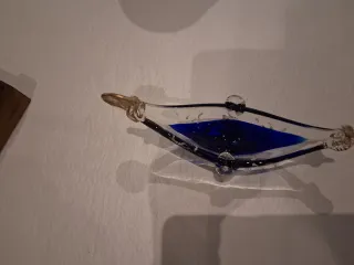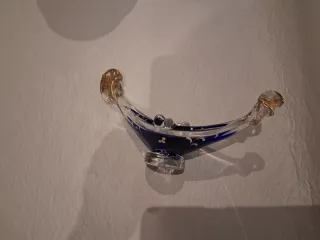Figura decorativa de cristal con forma de góndola. Contiene un líquido azul en su interior. Cristal de Murano. Se vende por mudanza entra en mi perfil. - Diseño elegante y único. - Material: Cristal soplado. - Color: Transparente con detalles en azul y dorado.