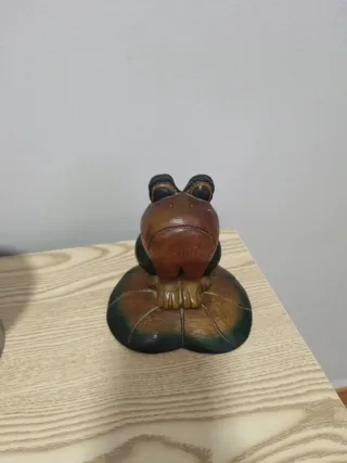 Figura decorativa de madera con forma de sapo posado sobre una hoja. - Material: Madera. - Diseño: Sapo sobre hoja.