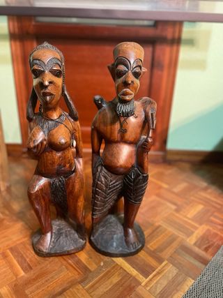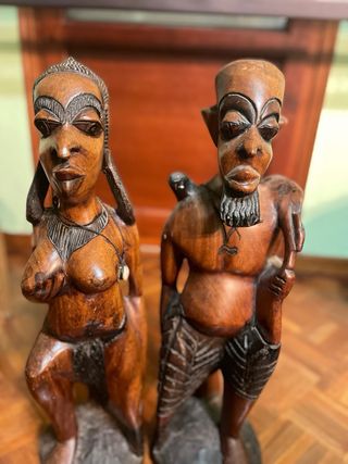 Par de figuras decorativas de madera con un diseño africano. - Hechas de madera tallada. - Representan a una pareja. - Base de piedra.