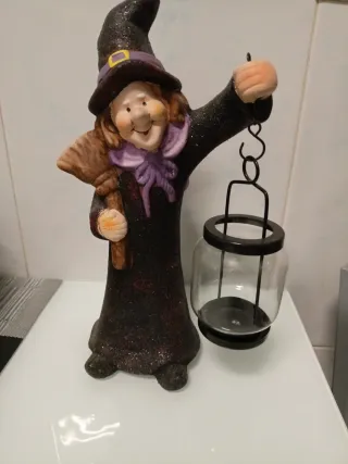 Figura decorativa de bruja con escoba y farolillo. - Diseño detallado con purpurina. - Incluye escoba y farolillo metálico con cristal.
