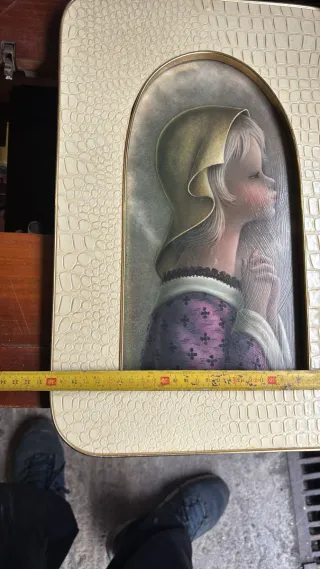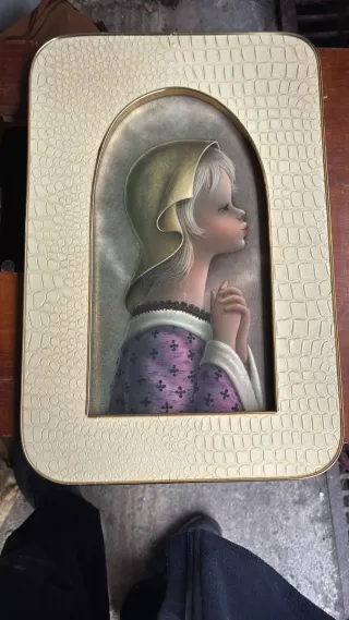 Figura decorativa de una niña en actitud de oración. Presenta un estilo artístico único y delicado. - Marco con textura en color beis - Detalle de encaje en el cuello de la vestimenta. - Vestimenta morada con estampado floral.