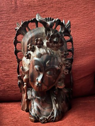Figura decorativa de madera de ébano, tallada a mano con gran detalle. - Material: Madera de ébano. - Técnica: Tallado a mano. - Diseño: Rostro femenino con adornos florales y un ave. Tiene un pequeño desperfecto, el ala del pájaro esta rota, hay foto. Comprada en Ubud, Indonesia en 1982.