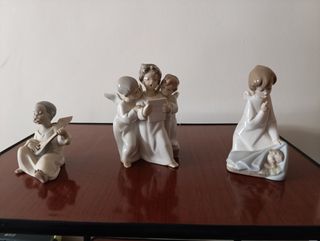 Conjunto de figuras de porcelana de Lladró. Se venden juntos o por separado. No hago envíos, entrega en mano en Algorta o en Bilbao. Todas las figuras tienen su logo de Lladró en la parte inferior. - Tres ángeles cantando. 250 €. 29 cm alto x 12 ancho. - Un ángel tocando un instrumento. 130 €. 11 cm alto x10 ancho. - Un ángel rezando. 130 €. 17 cm alto x 10 cm ancho.