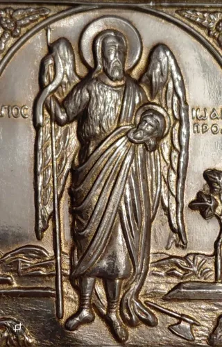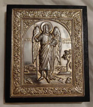 Icono bizantino de reproducción, elaborado en alpaca y madera. Medidas 7,5 cm x 8,5 cm. - Detalle de figura religiosa. - Marco ornamental.