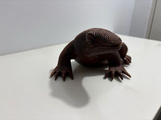 Figura decorativa de lagarto, elaborada en madera con un detallado tallado. - Diseño realista con escamas. - Tonos marrones y dorados. - Ideal para coleccionistas o decoración temática.