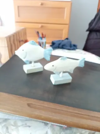 Conjunto de dos figuras decorativas con forma de pez. - Diseño en color blanco y azul. - Base rectangular para su exposición. - un pez con 12 cm de alto y el otro 10