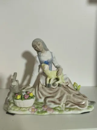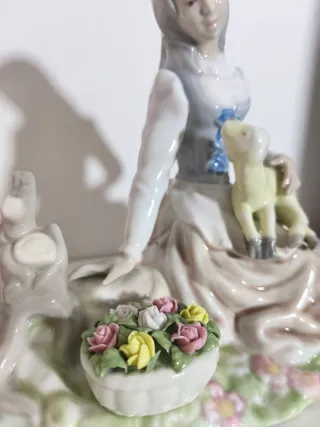Preciosa figura de porcelana que representa a una joven sentada con un cordero en brazos, rodeada de elementos naturales como un tronco y un cesto de flores. - Detallada figura de porcelana. - Escena campestre con joven, cordero y flores. - Base decorativa con motivos florales y vegetación. Firma guerra san martin