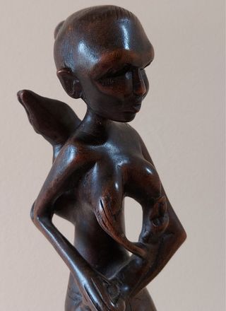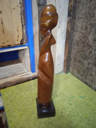 Figura decorativa tallada en madera maciza. - Diseño abstracto con forma femenina. - Base de madera oscura.medidas 45x8x8