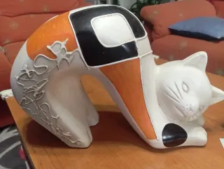 Figura decorativa de un gato con diseño moderno y artístico. Su forma estilizada y los detalles de color le dan un toque único. - Diseño abstracto con bloques de color naranja, blanco y negro. - Detalles en relieve blanco sobre el cuerpo. - Base blanca con una mancha negra. 10€ cada una