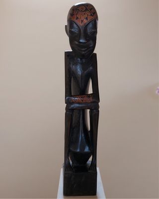 Figura decorativa de madera tallada con motivos tribales. - Diseño tradicional africano. - Detalles pintados en la cabeza, brazos y espalda. - Base cuadrada para exhibición - Mide 40cm - Comprado a artesano en Senegal
