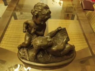 Figura decorativa de bronce con un niño y un oso. Representa una escena tierna y artística. - Material: Bronce. - Diseño detallado.