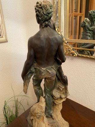 Figura decorativa de un nativo americano con lanza y escudo. - Detalles en la vestimenta y accesorios. - Representación de un guerrero. - Ideal para coleccionistas.