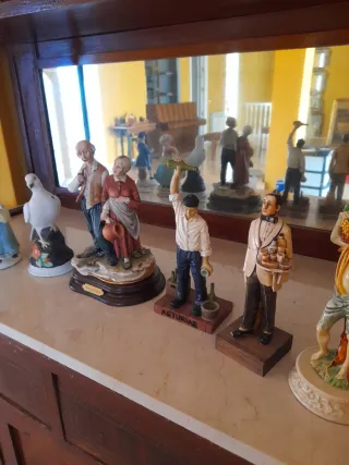 Conjunto de ocho figuras decorativas de estilo vintage. Cada figura se vende individualmente. - Figuras de cerámica con detalles pintados a mano. - Diseños variados que representan escenas cotidianas y personajes. - Base de madera o cerámica para cada figura.