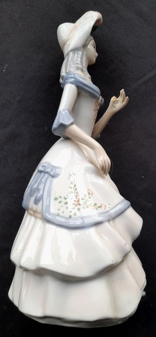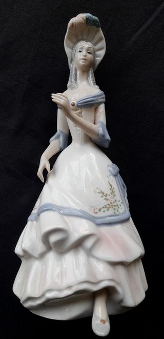 Elegante figura de dama realizada en porcelana esmaltada, datada en el año 1969. Cerámica Tengra (Made in Spain). Brazo izquierdo restaurado y falta el dedo pulgar, defecto imperceptible en posición frontal. - Diseño detallado de época. - Acabado brillante y delicado. - Pieza de colección. Medidas: 32 cm alta x 20 cm ancha. Más y variados artículos en mi perfil