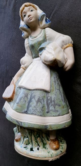 Figura de porcelana esmaltada de una niña lavandera. Representa a una figura con un vestido tradicional y un cesto. Porcelana artística levantina (PAL) Made in Spain. En muy buen estado de conservación. - Detalle de la vestimenta con delantal y lazo. - Base decorada con motivos vegetales. Medidas: 28 cm alta x 16 cm ancha x 11 cm fondo. Más y variados artículos en mi perfil.