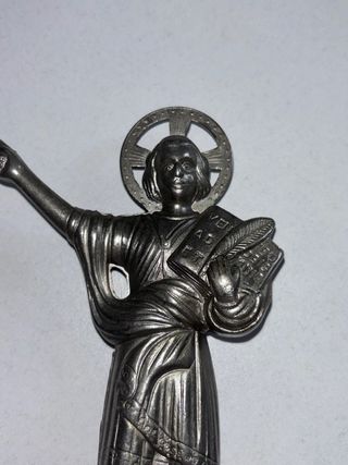 Figura metálica de San Pancracio, santo tradicionalmente asociado al trabajo, la prosperidad y la buena fortuna. Presenta halo, gesto de bendición y libro, con inscripción en la base: “S. Pancracio – V. U. Trabajad”. Pieza sólida, con pátina natural por el paso del tiempo, ideal para altar, colección religiosa o decoración vintage.